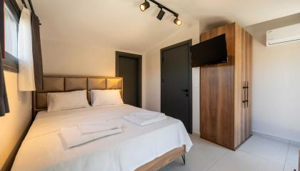 Double bed, bedside table, wardrobe, air conditioner, TV, en-suite bathroom