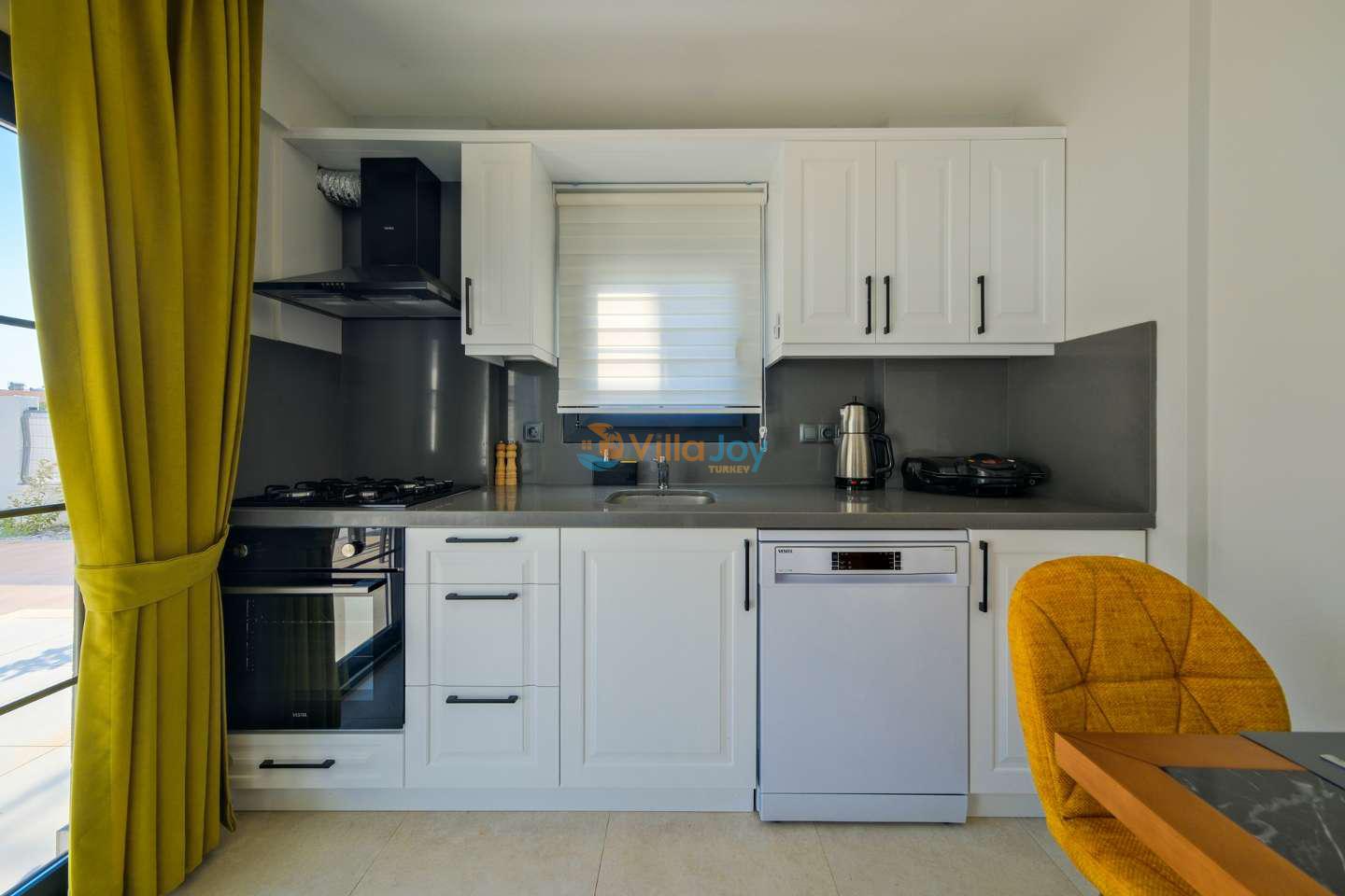 This Fethiye villa rental stands out with its bright and spacious interior design, furnished with modern furniture suitable for the villa’s full capacity.